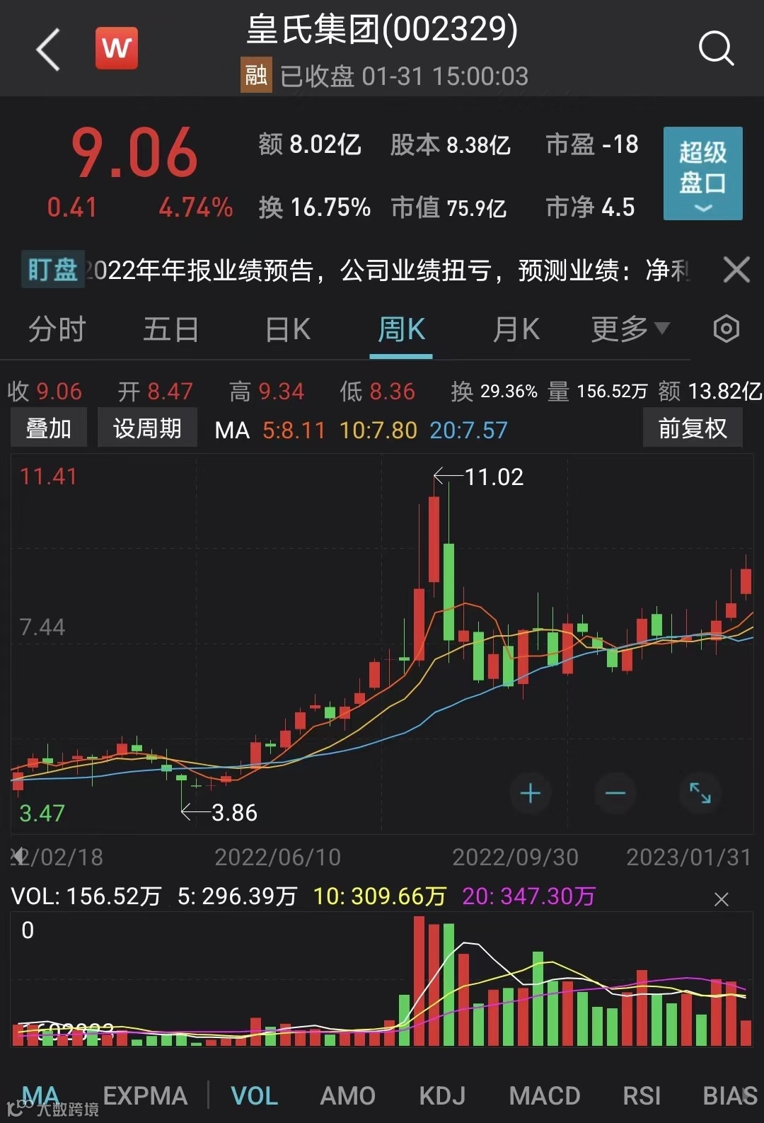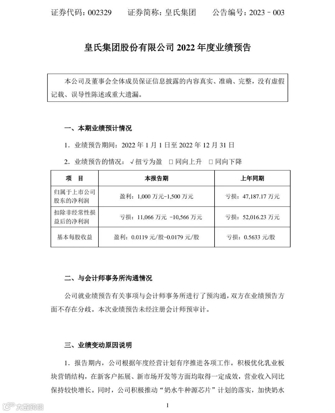 消息面上,1月30日晚间,皇氏集团披露业绩预告,公司预计2022年归属于上市公司股东的净利润1000万元-1500万元,同比扭亏为盈。