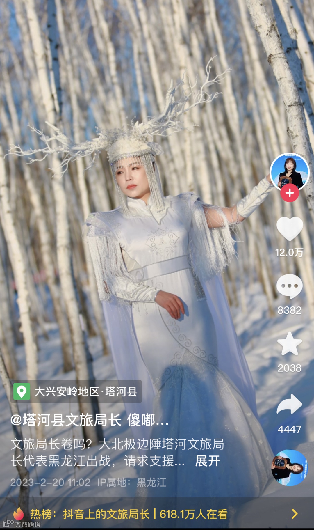 短视频中,黑龙江省塔河县文旅局局长都波身穿“白鹿服饰”在一片满是积雪的白桦林,带大家领略自然风光,俨然现实版的“冰雪女王”。