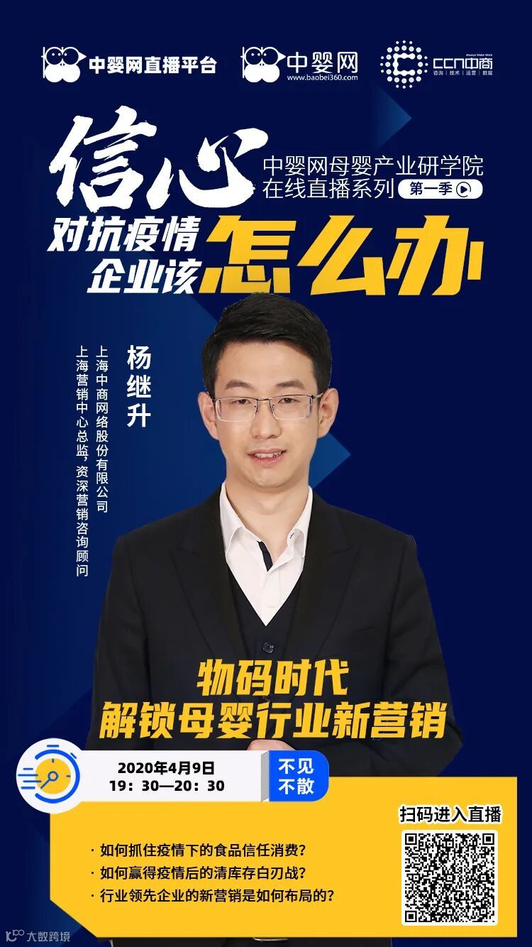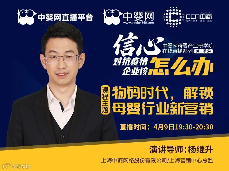 今晚(4月9日)19:30,受中婴网母婴产业研学院【第一季,信心!对抗疫情,企业该怎么办】系列公益直播课程邀请,来自上海中商网络股份有限公司(以下简称CCN中商)的杨继升先生将为大家带来一场《物码时代,解锁母婴行业新营销》线上直播分享。