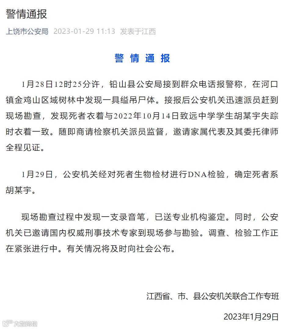 1月28日12时25分许,铅山县公安局接到群众电话报警称,在河口镇金鸡山区域树林中发现一具缢吊尸体。接报后公安机关迅速派员赶到现场勘查,发现死者衣着与2022年10月14日致远中学学生胡某宇失踪时衣着一致。随即商请检察机关派员监督,邀请家属代表及其委托