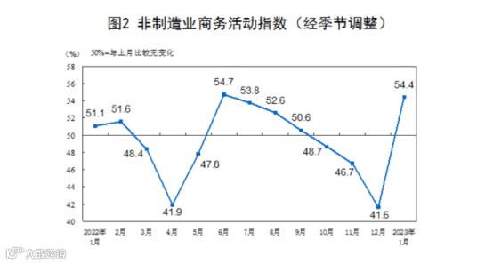 数据显示,1月份,非制造业商务活动指数为54.4%,比上月上升12.8个百分点,重返扩张区间,非制造业景气水平触底回升。