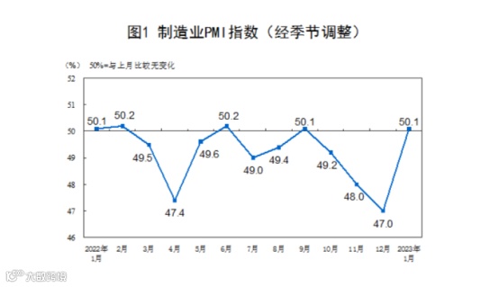 数据显示,1月份,制造业采购经理指数为50.1%,比上月上升3.1个百分点,升至临界点以上,制造业景气水平明显回升。