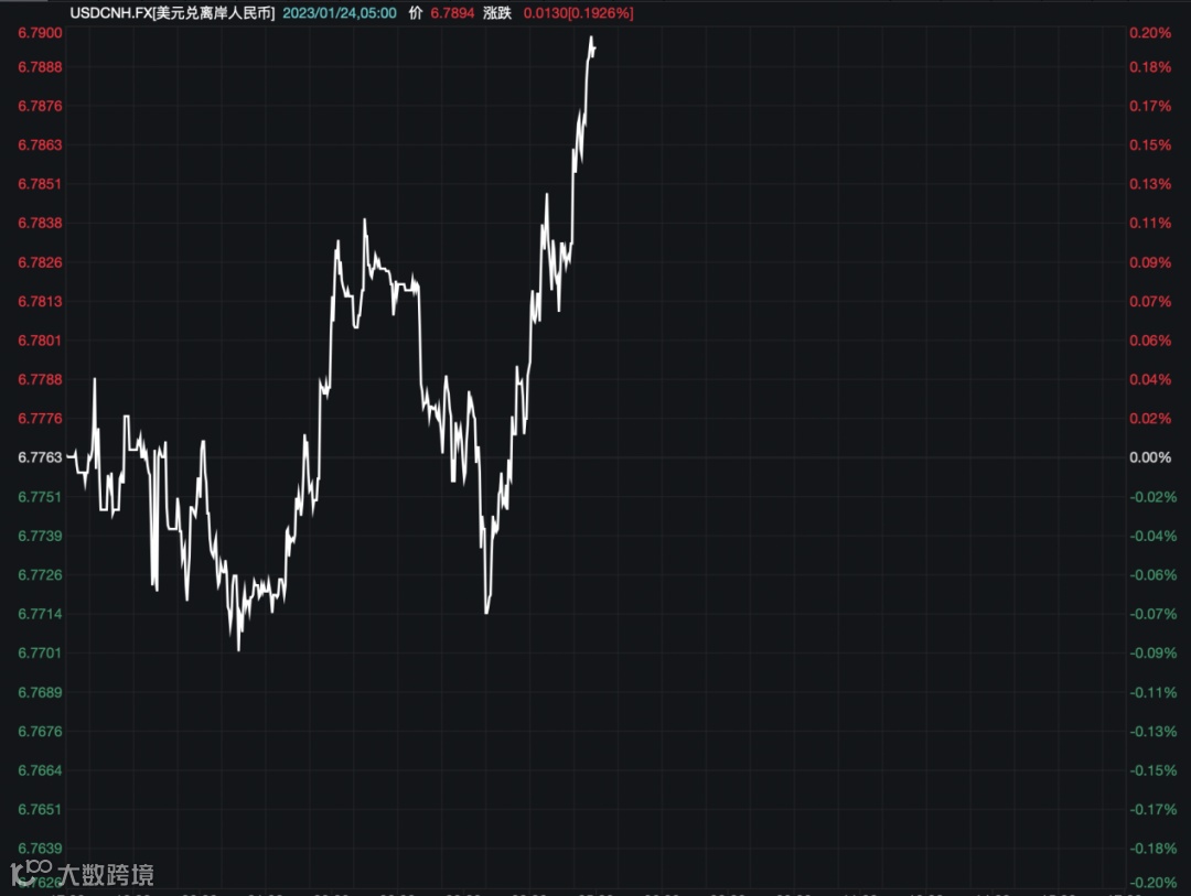 1月24日18时,离岸人民币汇率与1月20日收盘价相比,略微下跌54个基点。专家表示,2023年,受外部压力趋缓、内部因素改善等影响,人民币汇率有望在波动中重回上升通道。