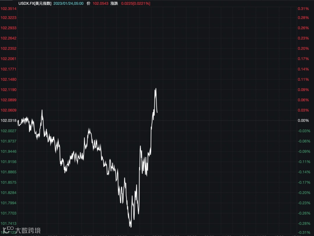 在人民币汇率逐渐攀升之际,美元指数则呈现下跌之势,且人民币汇率升值幅度大于美元跌幅。截至北京时间1月24日18时,美元指数报102.05点。从2023年年初至1月23日,美元指数已累计下跌1.41%。