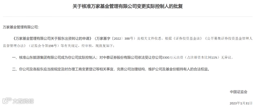 2月3日晚间,证监会发布公告称,核准山东能源集团有限公司成为万家基金实际控制人;对中泰证券股份有限公司依法受让万家基金公司3300万元(占注册资本比例11%)出资无异议。万家基金及各股东应当按规定及时办理工商变更登记等相关事宜,完善公司治理结构,维护公司及基金份额持有人的合法权益。
