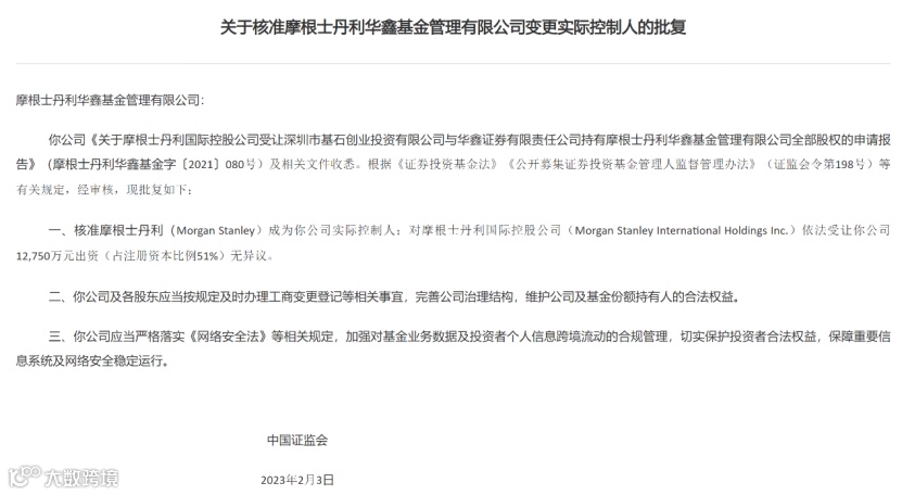 2月3日晚间,证监会官网显示,摩根士丹利华鑫基金51%股权转让事项已获核准。摩根士丹利国际控股公司受让深圳市基石创业投资有限公司与华鑫证券有限责任公司持有的摩根士丹利华鑫基金管理有限公司全部股权。至此,摩根士丹利华鑫基金成为国内又一家外资独资公募基金公司。
