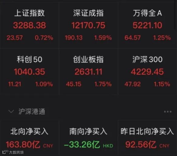 今天上午,A股迎来预期内高开,之后震荡回落,涨幅收窄。截至上午,上证指数上涨0.72%,深证成指上涨1.59%,创业板指上涨1.75%,北向资金净流入163.8亿元。