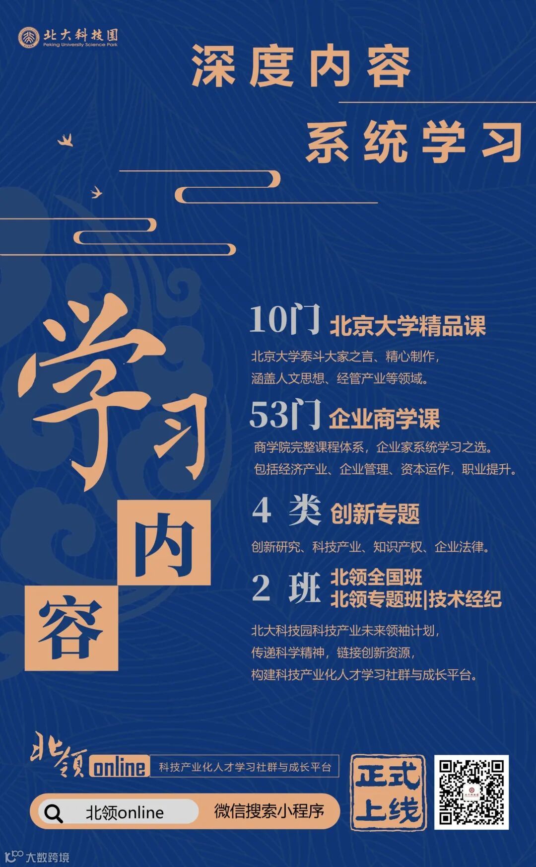 北领online精心准备10门北大精品课,53门企业商学课,4类创新专题,以及北领全国班、北领专题班两大班级,内容涵盖人文思想、经管产业、企业管理、技术经纪、职业提升等提高企业人才创新创业水平的系统课程。为迎接北大122年校庆,将持续推出系列开放课程,敬请关注。