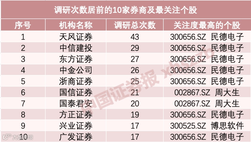 值得注意的是,调研频次居前十的券商中,有7家券商最关注的个股为民德电子。