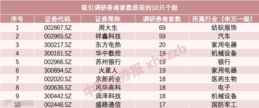 临近春节,黄金珠宝业迎消费小高峰,因此周大生获69家券商调研,数量居首;祥鑫科技获59家券商调研,数量居第二。此外,东方电热、华中数控、苏州银行等个股的调研券商家数亦居前。