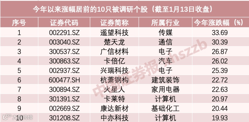 从个股表现来看,截至1月13日收盘,遥望科技今年以来涨幅达33.69%居首;其次为楚天龙,涨幅为30.39%;广信材料、卡倍亿、兴瑞科技等涨逾25%。