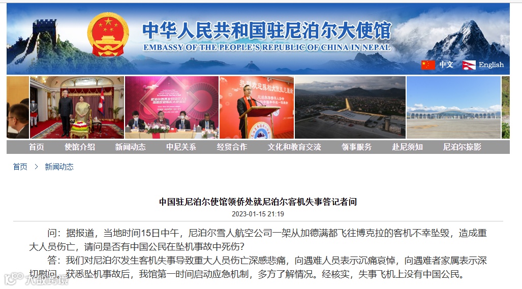 当地时间1月15日晚,据中国驻尼泊尔大使馆官网消息,经核实15日上午在尼泊尔博克拉坠毁的航班上没有中国公民。