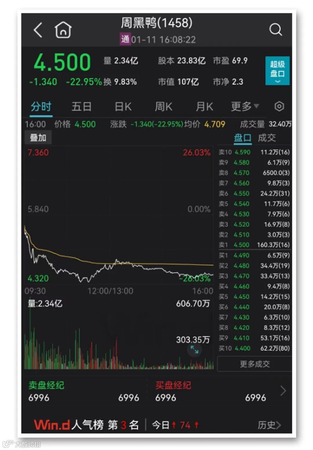 消息面上,有市场传言称,周黑鸭给出2023年的业绩利润指引只有1.5亿元-2亿元。而周黑鸭2021年的归母净利润为3.42亿元,2022年上半年的归母净利润为0.18亿元。