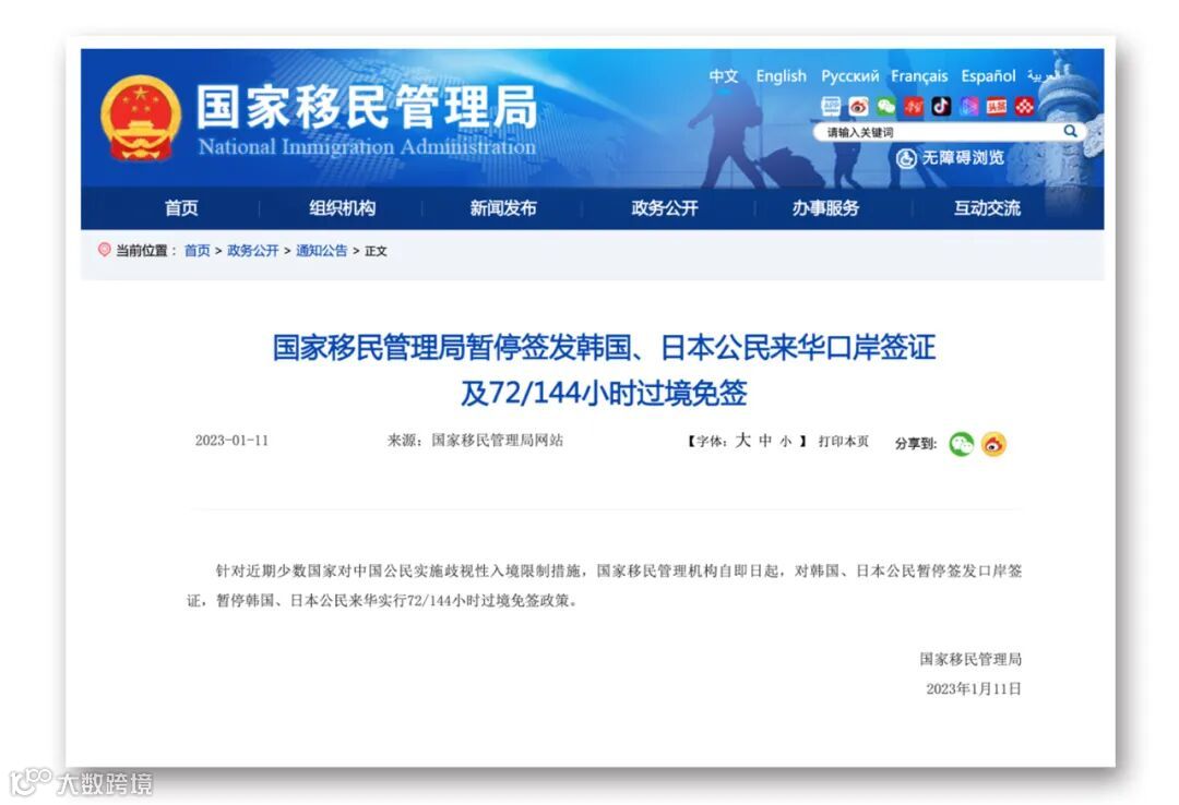 国家移民管理局网站11日发布公告,针对近期少数国家对中国公民实施歧视性入境限制措施,国家移民管理机构自即日起,对韩国、日本公民暂停签发口岸签证,暂停韩国、日本公民来华实行72/144小时过境免签政策。