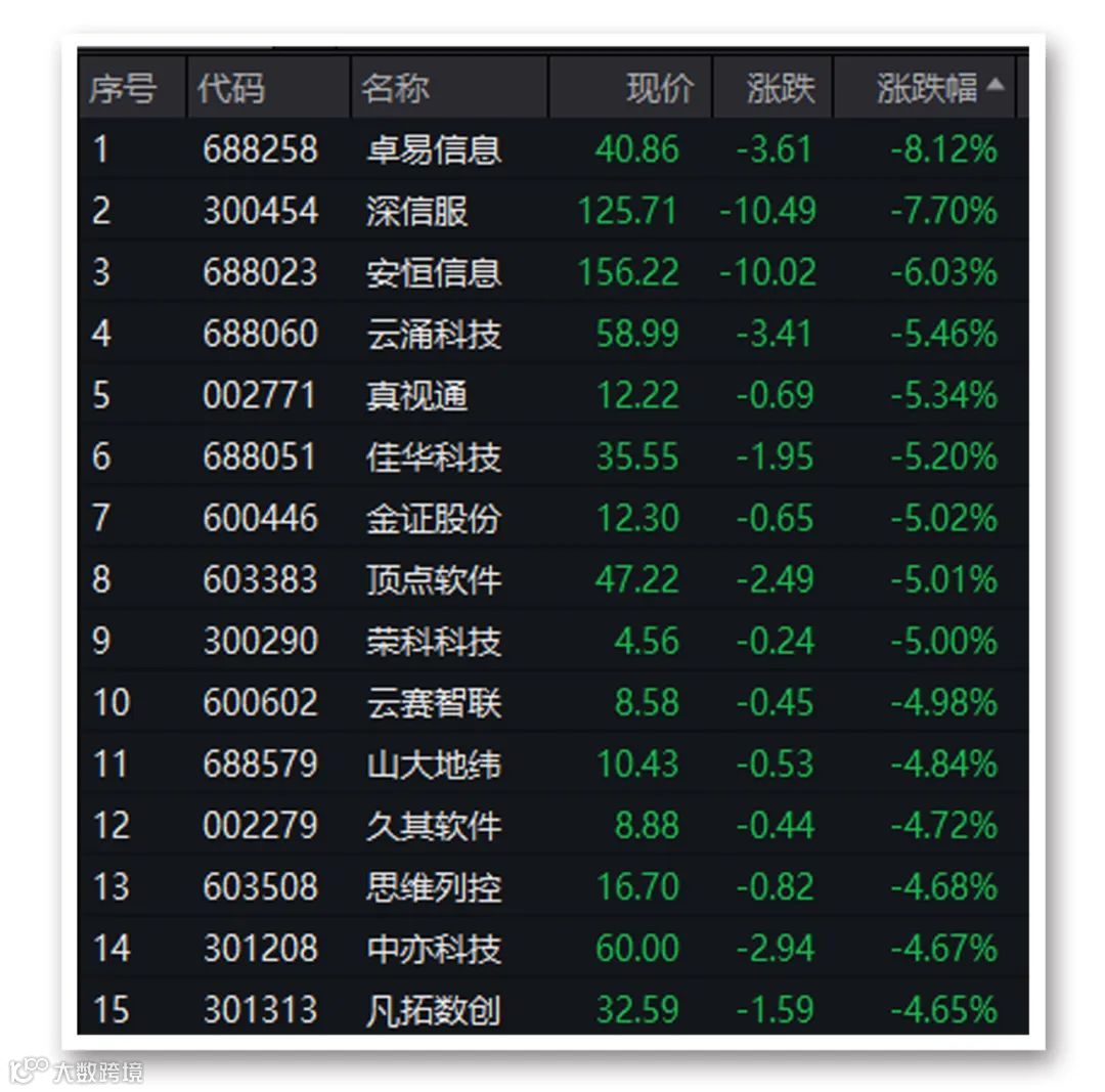 软件股今日集体重挫,位居跌幅前列。截至收盘,卓易信息、深信服等多股跌逾5%。