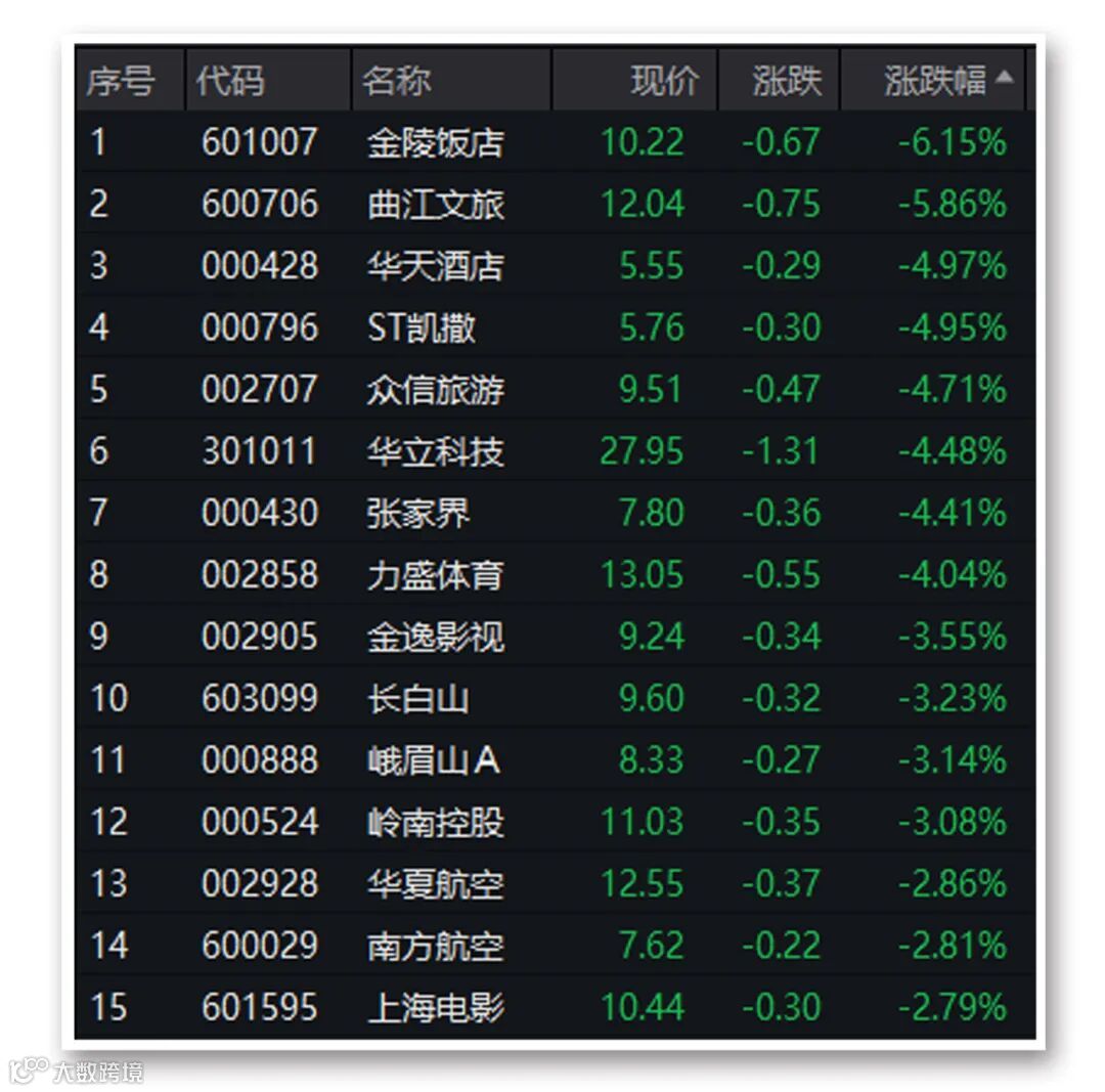 大范围的寒潮天气可能会影响到人们旅游出行的安排,A股旅游出行板块今日大跌,金陵饭店、曲江文旅跌逾5%。