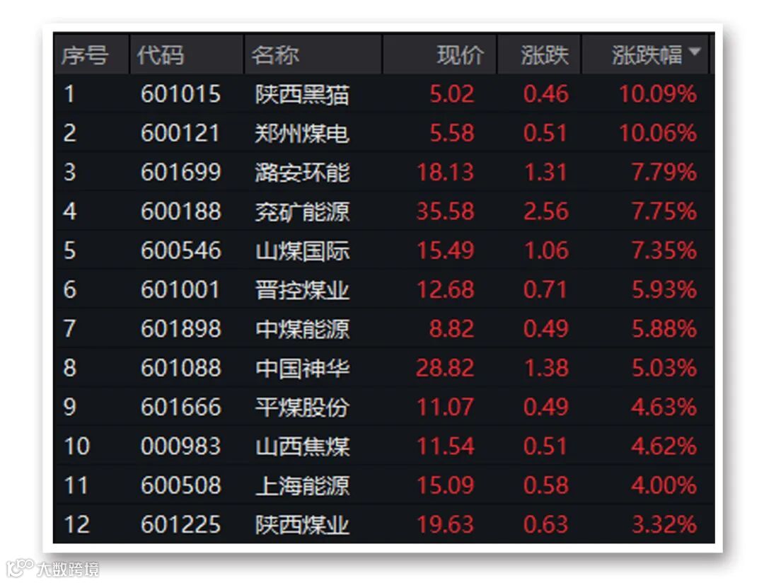 煤炭板块中,陕西黑猫、郑州煤电涨停,兖矿能源、中煤能源和中国神华均涨逾5%。
