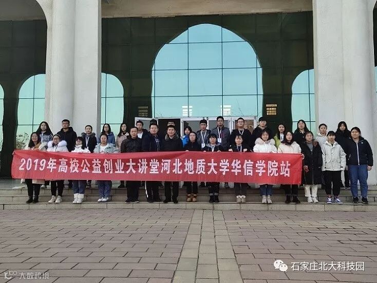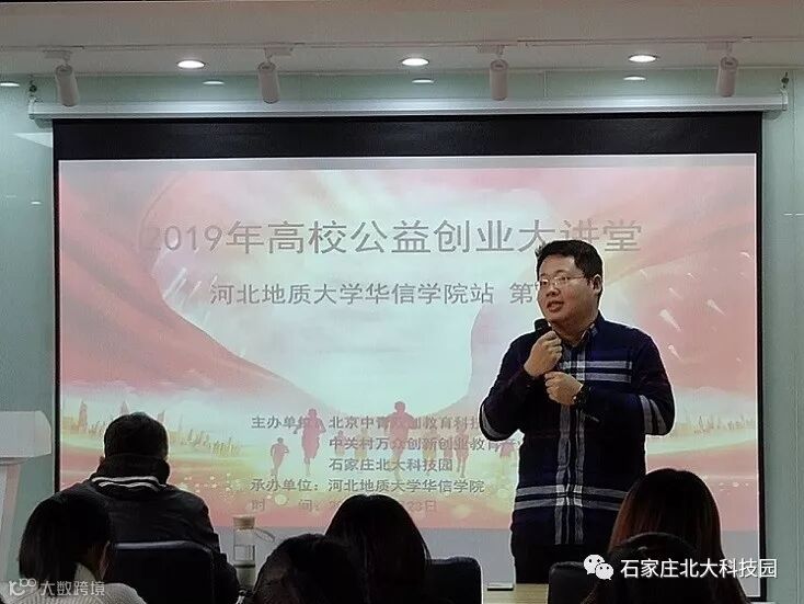 2019年12月23日 ,由石家庄北大科技园、北京中青双创教育科技院、中关村万众创新创业教育产业促进中心主办,河北地质大学华信学院承办的“2019年高校公益创业大讲堂河北地质大学华信学院站第2期”在五四讲堂举行,40余名高校大学生参加此次活动。
