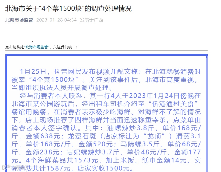 1月28日凌晨,北海市市场监督管理局就近日网络上引发关注的“4个菜1500块”一事通报称,经调查,相关店家存在支付出租车司机回扣招揽客人、未与消费者充分沟通即匆忙配菜下单、部分海鲜经烹饪后份量略少等问题。