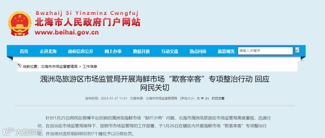 北海市人民政府网站1月27日消息,针对1月25日网民在微博平台反映的涠洲岛海鲜市场“缺斤少两”问题,北海市涠洲岛旅游区市场监管局高度重视,迅速行动,在自治区市场监管局指导下,按照市市场监管局的工作部署,于1月26日在辖区内开展海鲜市场“欺客宰客”专项整治行动,并当场对违反明码标价的7个摊位予以行政处罚。