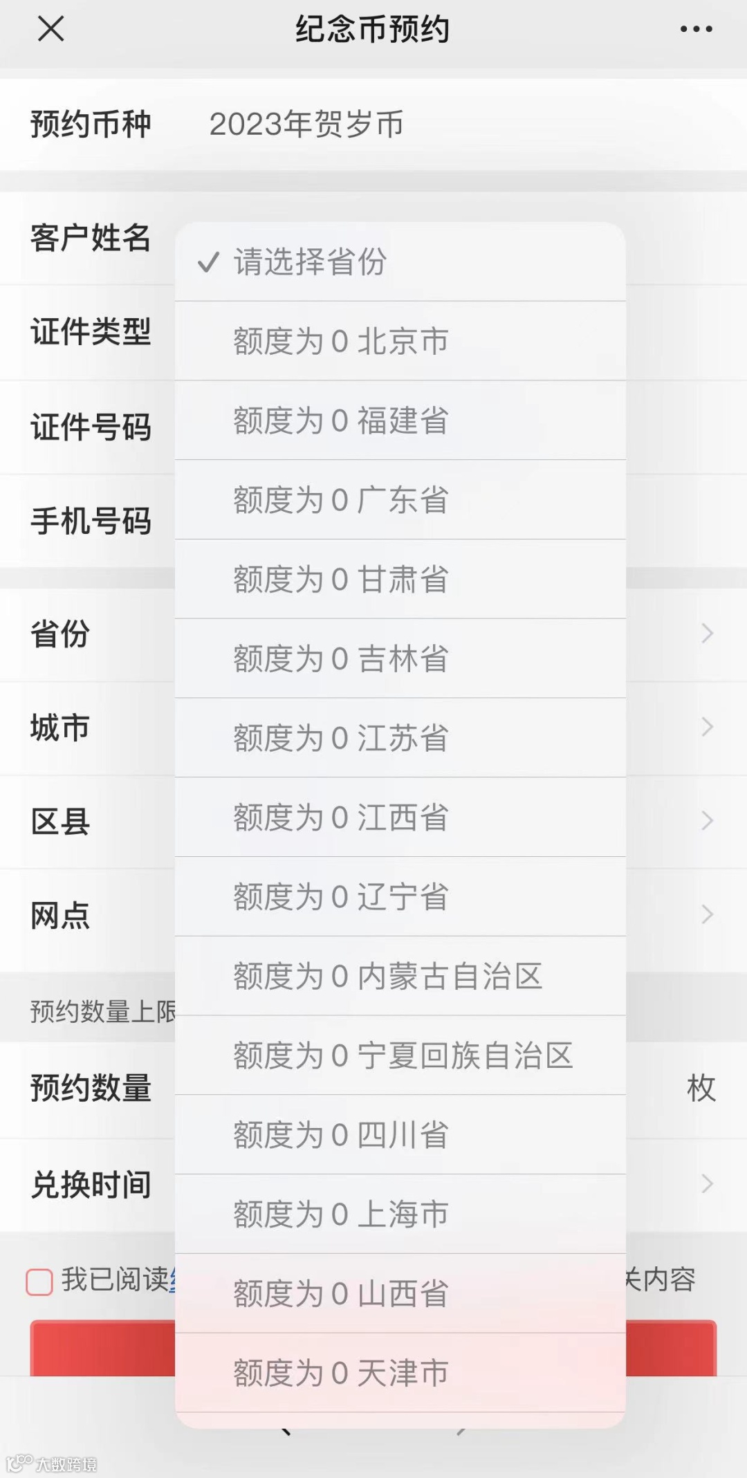 记者昨晚10点45分点击工商银行2023年贺岁纪念币预约链接时,发现多数地区的纪念币额度已为0。