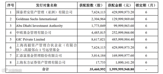 公告显示,此次发行的发行对象最终确定为8名,均在143名发送《认购邀请书》特定对象名单内,最终获配对象包括国泰君安资产管理(亚洲)有限公司、中欧基金管理有限公司、汇添富基金管理股份有限公司、上海东方证券资产管理有限公司等。