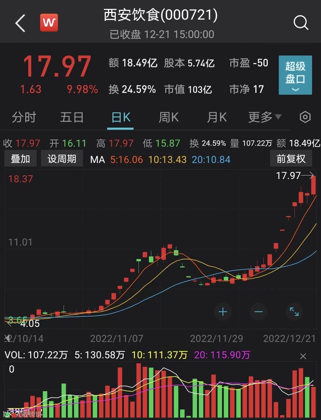 12月21日,西安饮食再次强势涨停,收盘报17.97元,上涨9.98%,全天成交18.49亿元,换手率24.59%,最新市值103亿元。