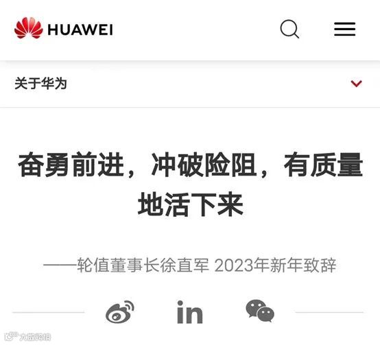 12月30日,华为轮值董事长徐直军发表公司2023年新年致辞《奋勇前进,冲破险阻,有质量地活下来》。