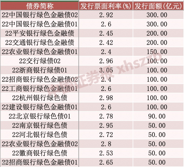 其中,发行规模最大的是中国银行发行的“22中国银行绿色金融债02”以及“22中国银行绿色金融债01”,发行面额分别为300亿元。“22平安银行绿色金融债”以及“22交通银行绿色金融债”发行面额也均达到200亿元,位居前列。