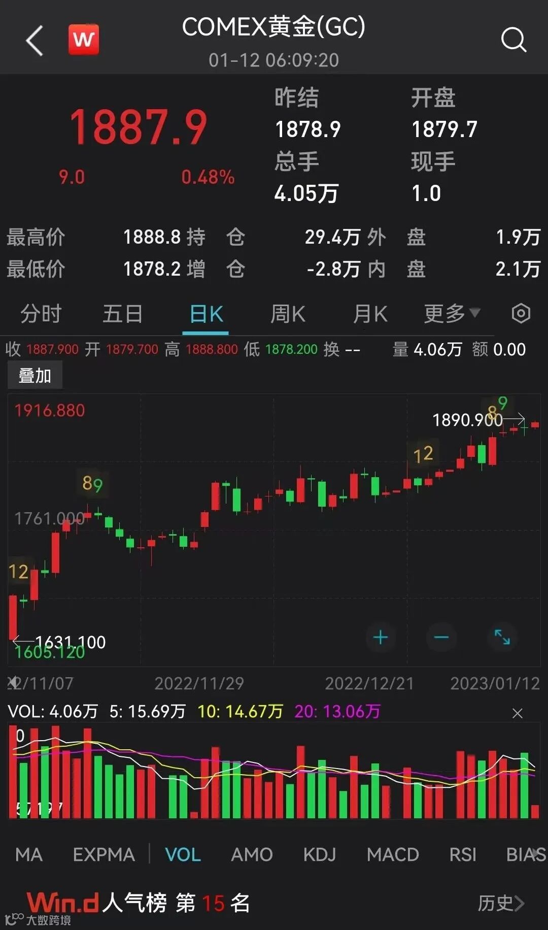 Wind数据显示,截至北京时间1月12日19点24分,COMEX黄金达1887.9美元。较2022年11月1日以来的最低1618.30美元涨近15%。
