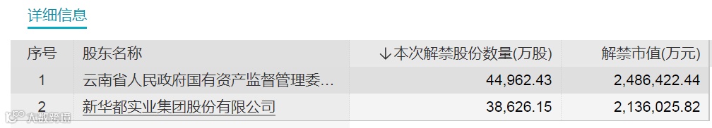 具体来看,在下周面临解禁的77只股票中,解禁市值最大的云南白药解禁股东为云南省国有股权运营管理有限公司、新华都实业集团股份有限公司,分别为云南白药第一、第二大股东。这两个股东的股份来自于云南白药2019年7月完成的定增,彼时的定增发行价为76.34元/股。