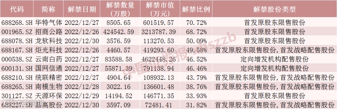 从市场表现来看,Wind数据显示,下周解禁市值居前的云南白药、招商公路、国网信通12月份以来分别下跌2.26%、3.69%、15.96%。