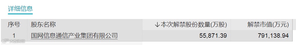 解禁市值第三大的国网信通解禁股东为国网信息通信产业集团有限公司,为国网信通第一大股东,其股份来自于国网信通2019年12月完成的定增,彼时的定增发行价为5.56元/股。