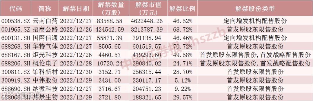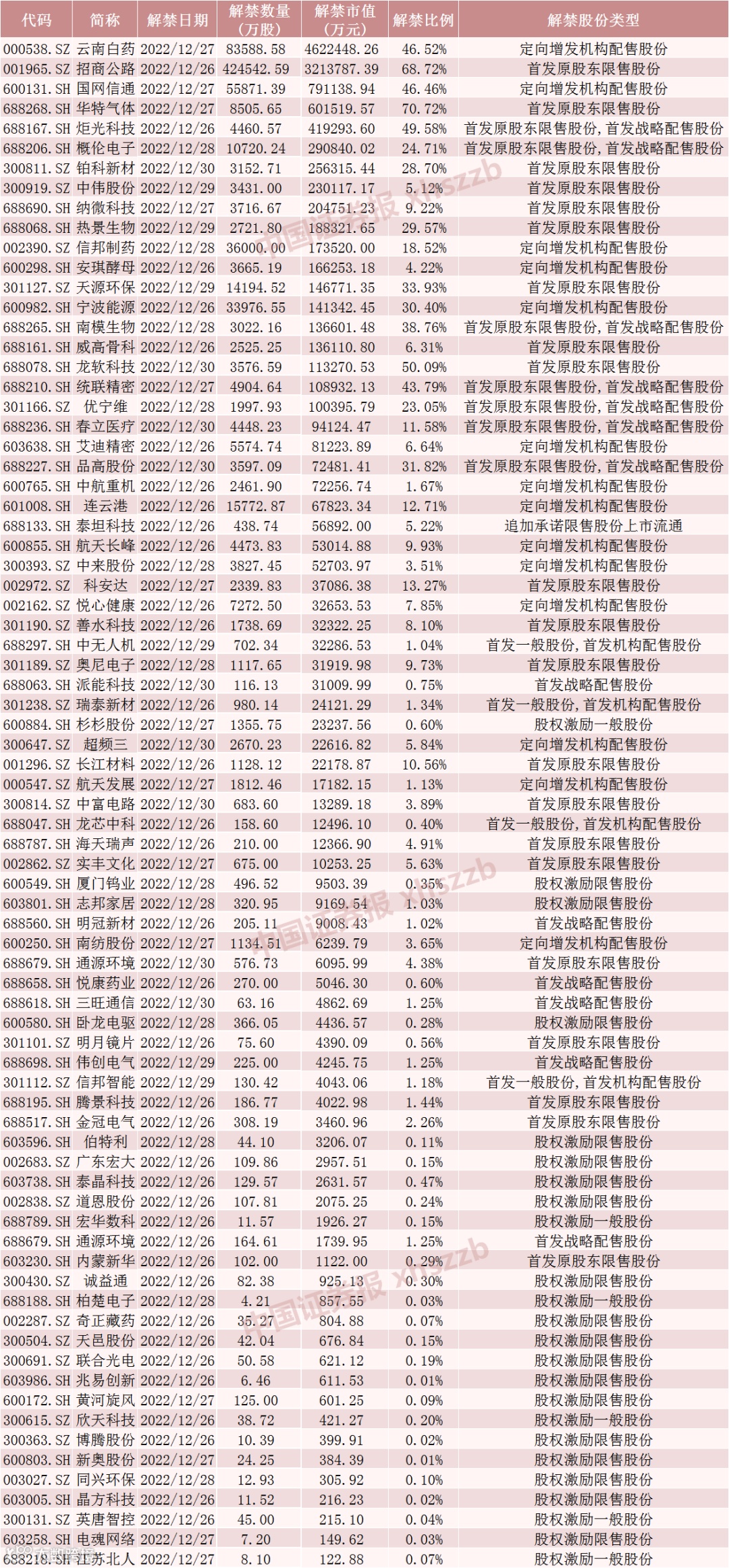 具体来看,Wind数据显示,云南白药12月27日将解禁8.36亿股,均为定向增发机构配售股份。招商公路12月26日将解禁42.45亿股,均为首发原股东限售股份。国网信通12月27日将解禁5.59亿股,均为定向增发机构配售股份。