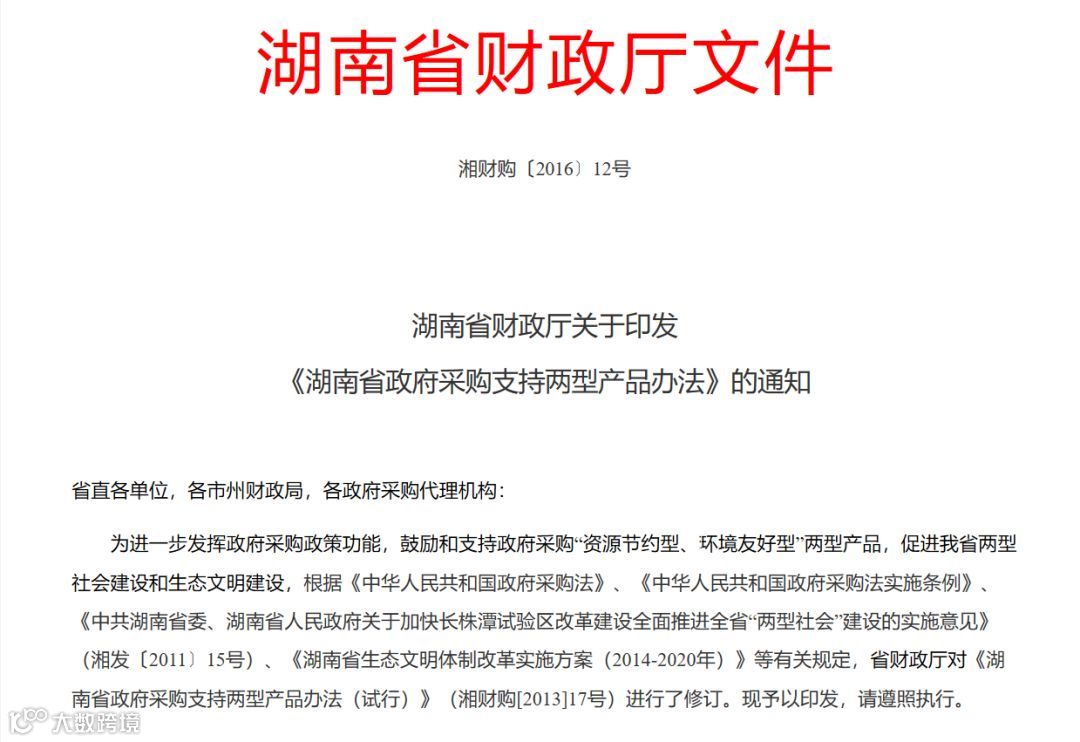 为进一步发挥政府采购政策功能,鼓励和支持政府采购“资源节约型、环境友好型”两型产品,促进我省两型社会建设和生态文明建设,根据《中华人民共和国政府采购法》、《中华人民共和国政府采购法实施条例》、《中共湖南省委、湖南省人民政府关于加快长株潭试验区改革建设全面推进全省“两型社会”建设的实施意见》、《湖南省生态文明体制改革实施方案(2014-2020年)》等有关规定,湖南省财政厅制定了《湖南省政府采购支持两型产品办法》。在采购管理、评审管理、监督管理等方面对政府投资项目优先采购两型产品做出了详细规定。