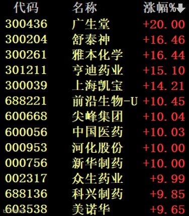 周三大跌的医药股今天上午迎来大涨,新冠治疗板块表现突出,广生堂迎来20%涨停。
