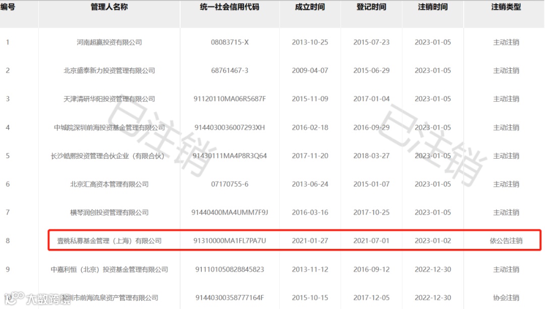 中国证券投资基金业协会官网最新数据显示,壹桃私募基金管理(上海)有限公司于1月2日注销,注销类型为“依公告注销”。壹桃私募基金实控人为何猷龙,成立期间并未注册过任何私募产品。