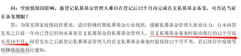 2022年5月26日,中国证券投资基金业协会在关于疫情期间优化私募基金登记备案相关服务的问答中提到,自该问答发布之日前一年内已登记但尚未备案首只私募基金的私募基金管理人,首只私募基金备案时限由现行的12个月延长至18个月。