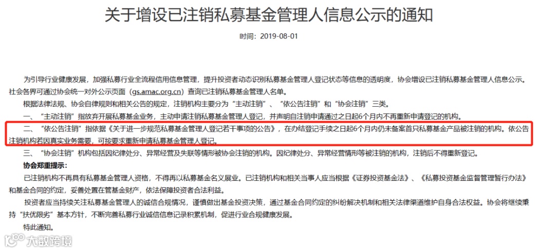 其中,“依公告注销”指依据《关于进一步规范私募基金管理人登记若干事项的公告》,在办结登记手续之日起6个月内仍未备案首只私募基金产品被注销的机构。依公告注销机构若因真实业务需要,可按要求重新申请私募基金管理人登记。