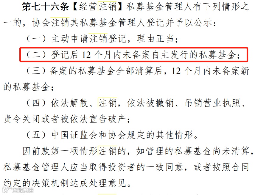 2022年12月30日,中国证券投资基金业协会发布《私募投资基金登记备案办法(征求意见稿)》,其中提到,登记后12个月内未备案自主发行的私募基金,协会注销其私募基金管理人登记并予以公示。