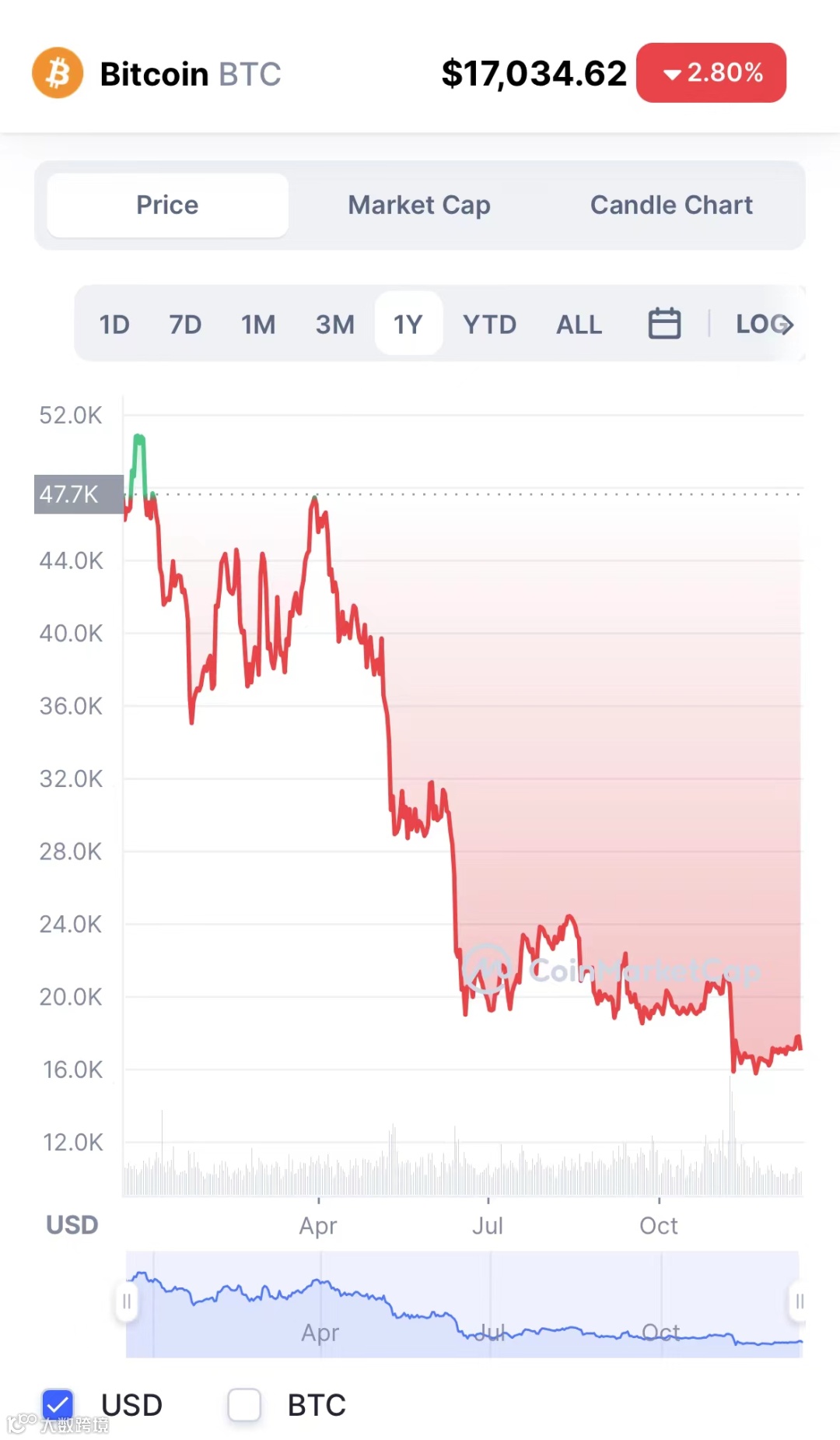 CoinMarketCap数据显示,在今年1月2日达到47343美元的年内最高点之后,比特币价格一路走低。截至12月17日,比特币暂报17034美元,创下2020年12月以来的最低水平,今年以来价格累计下跌超64%。