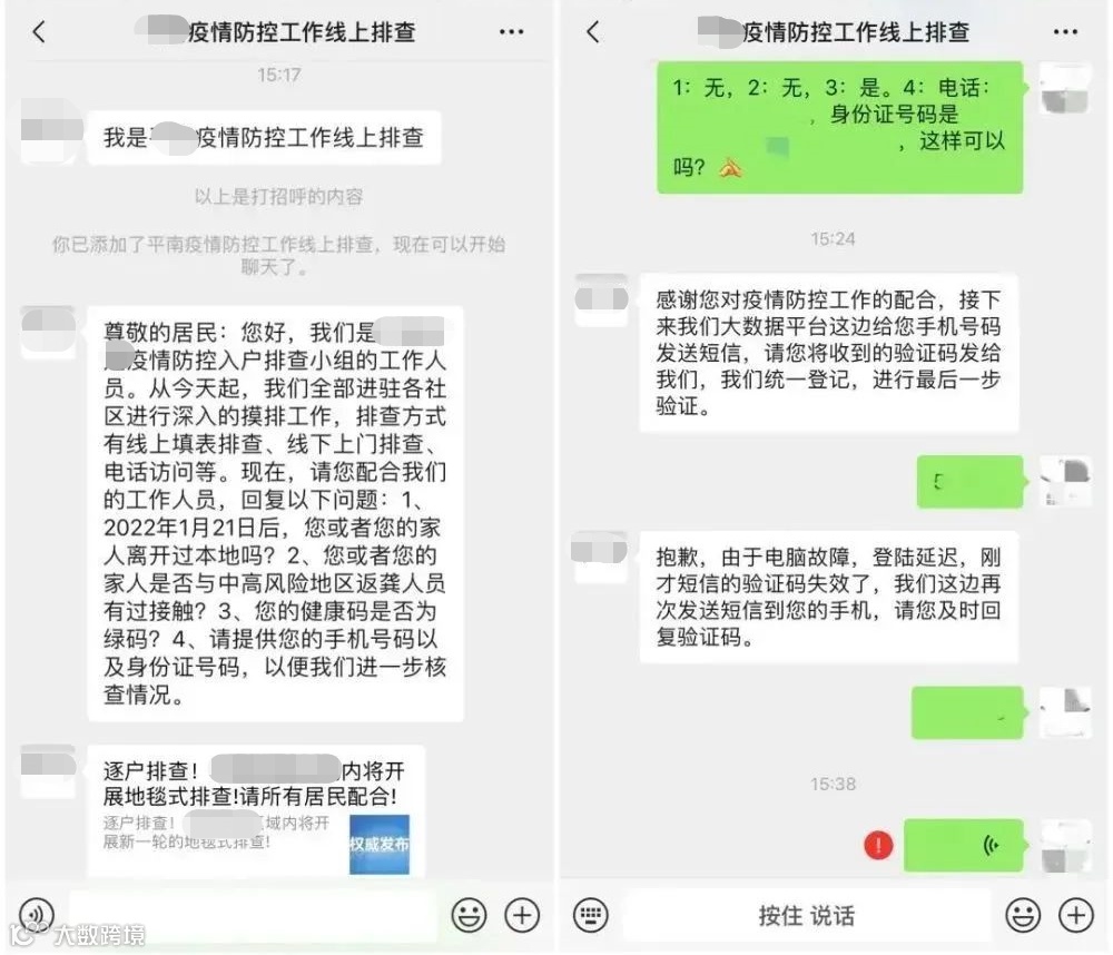 第一步:以疫情排查、涉疫需隔离、流调异常、“密切接触者”为由发送自查程序、核酸结果查询群、快速核酸检测结果、领取居家隔离补贴等为借口,令当事人心慌。