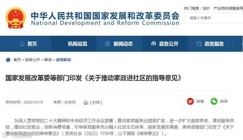 国家发改委12月19日消息,近日,国家发改委、商务部等11部门印发《关于推动家政进社区的指导意见》。
