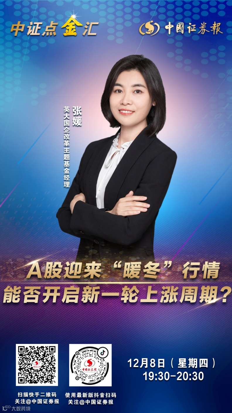 市场风格继续轮动,医药板块再度走强,“困境反转”行业大幅拉升,受此影响,投资者情绪依旧火热。站在当前时点来看,A股复苏能否持续?又该如何把握2023年的投资主线?12月8日(周四)晚7点半,英大国企改革主题基金经理张媛将做客中证报“中证点金汇”直播间,围绕围绕“A股迎来‘暖冬’行情,能否开启新一轮上涨周期?”为您在线答疑解惑。