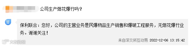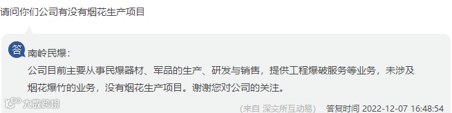 在投资者互动平台上,多家民爆企业被问到“公司是否生产烟花爆竹”。