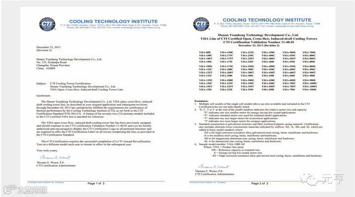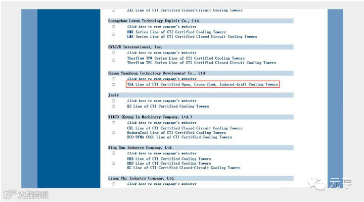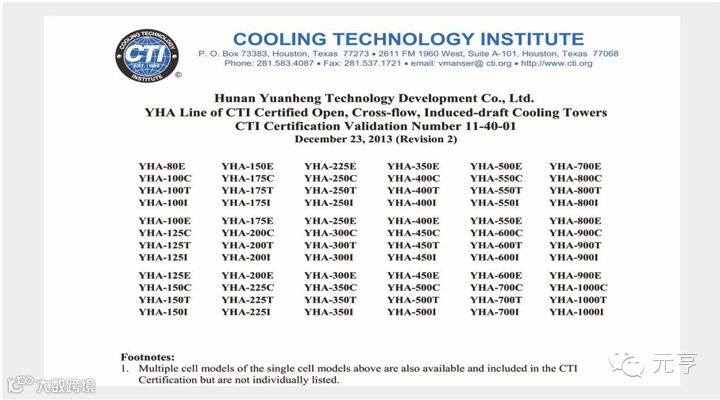 通过以上步骤,如果您从CTI网站、企业网站、产品样本、CTI认证证书所查证的信息:产品型号、冷却水流量、风机直径、电机功率、外型尺寸能够保持一致,则您选择的产品确实取得了CTI认证。