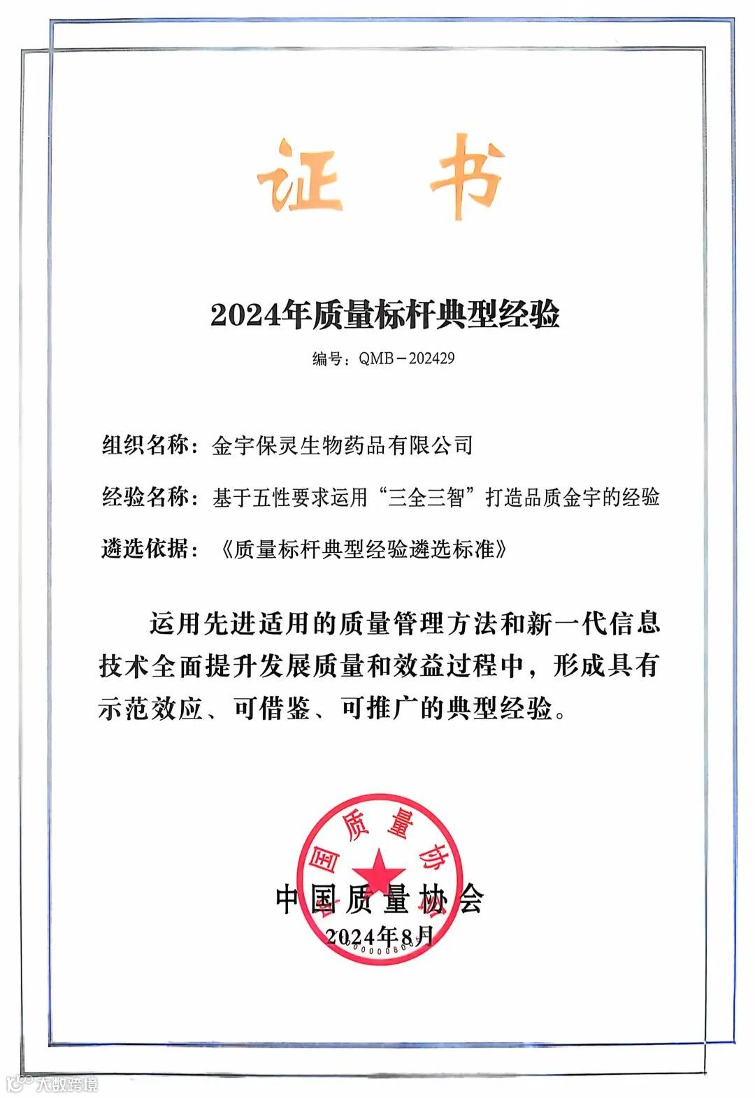 近日,金宇保灵生物药品有限公司提报的“三全三智”质量管理模式,入选“2024年质量标杆典型经验”。