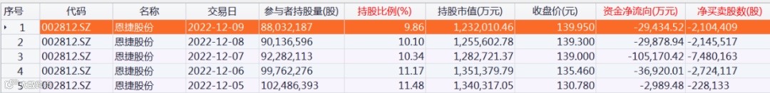 北向资金持股恩捷股份明细数据