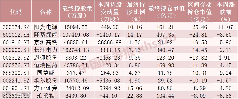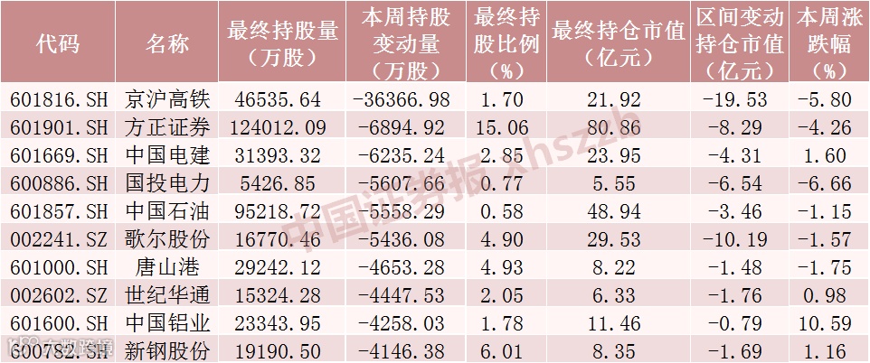 本周北向资金减仓股数前十个股
