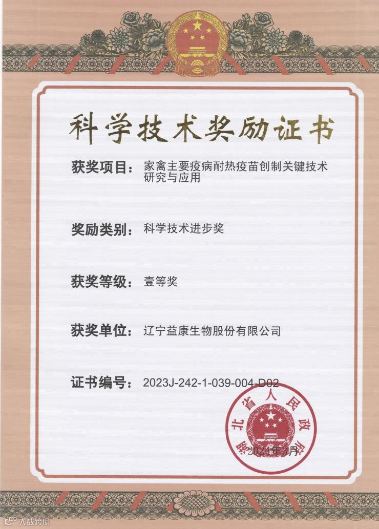益康公司作为第二完成单位与湖北省农业科学院畜牧兽医研究所等单位共同申报的“家禽主要疫病耐热疫苗创制关键技术研究与应用”于2024年3月获得湖北省科学技术进步一等奖。